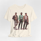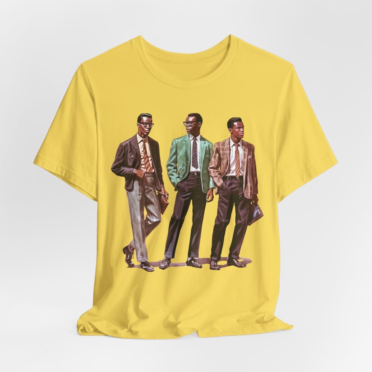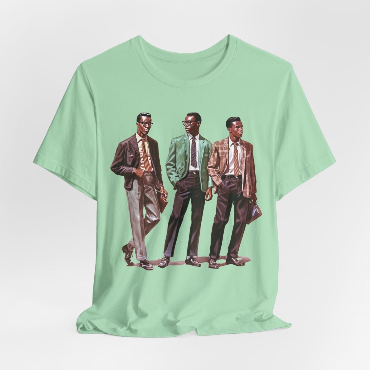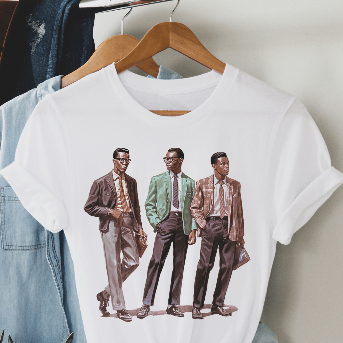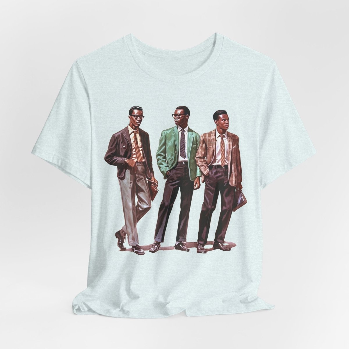 This ADULT UNISEX shirt is inspired by old school scholars and history. This fashion illustration showcases three sophisticated and intelligent black men dressed in blazers and slacks, exuding a timeless 1950s style. Crafted from 100% cotton, this shirt offers all-day comfort and breathability. Available in a variety of sizes and colors, you can choose the perfect fit and style. With its durable retail fit and reinforced side seams, it's an ideal choice for everyday wear. Whether you're on the move or relaxing, this shirt effortlessly combines comfort and style. The design featuring the three men in their distinguished fashion serves as a captivating conversation starter, adding a touch of creativity and personality to any outfit.