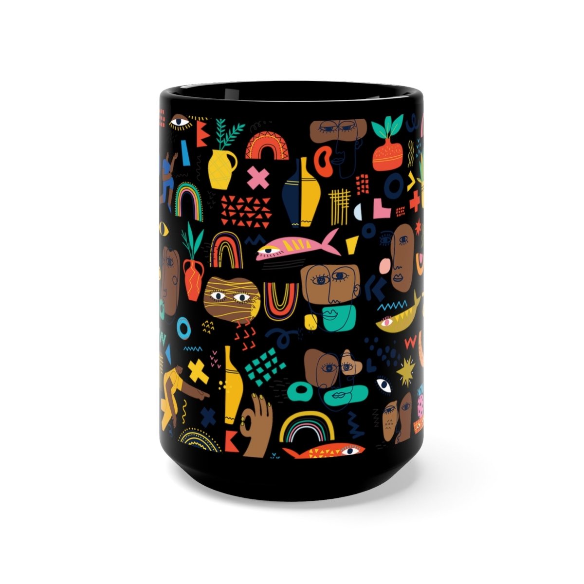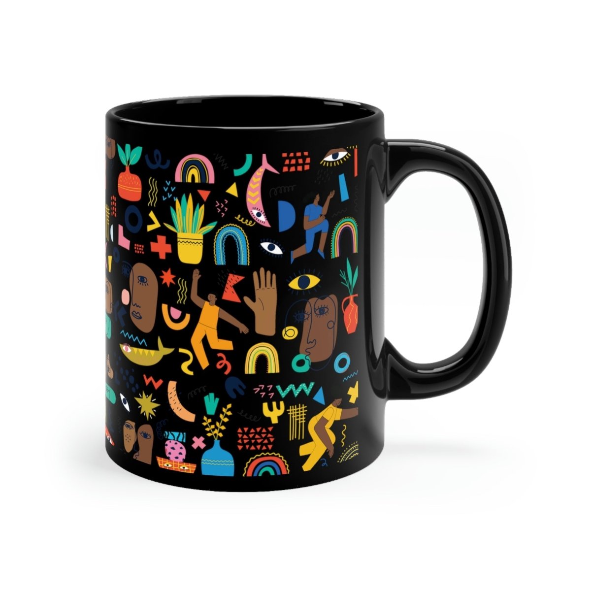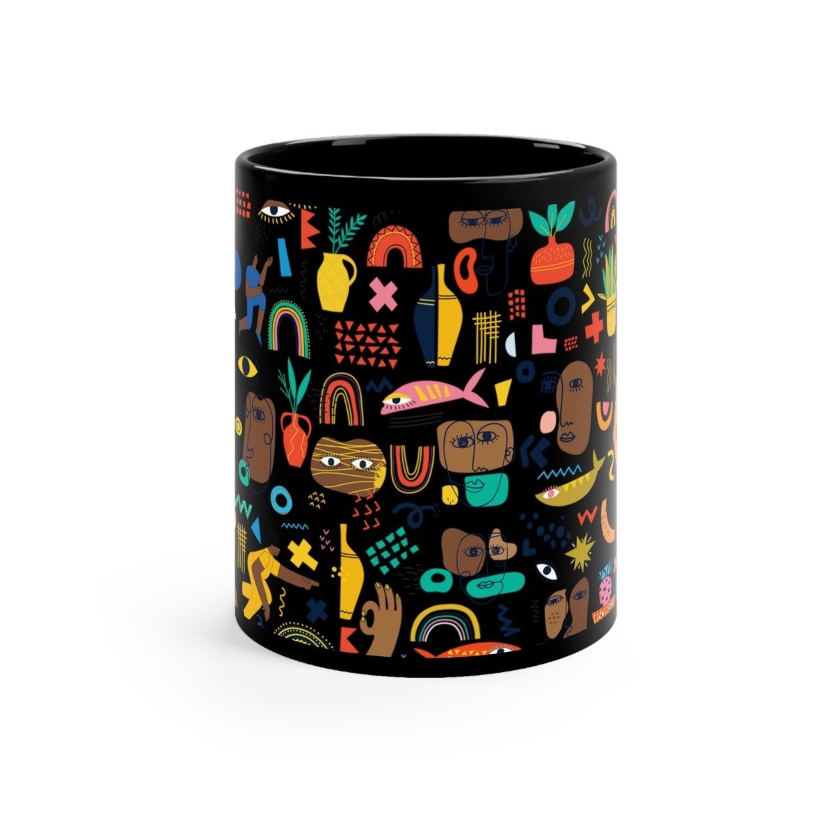 This black mug features brown people, line art faces, and geometric shapes combined into an abstract pattern. This artsy design appears against a ceramic mug that’s perfect for everyday use. It also offers a classic shape and is durable enough for the dishwasher and microwave. Available in 2 sizes.