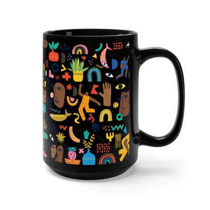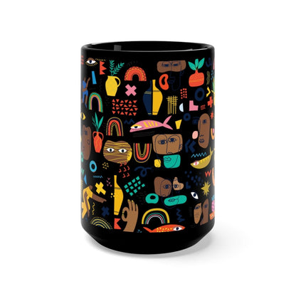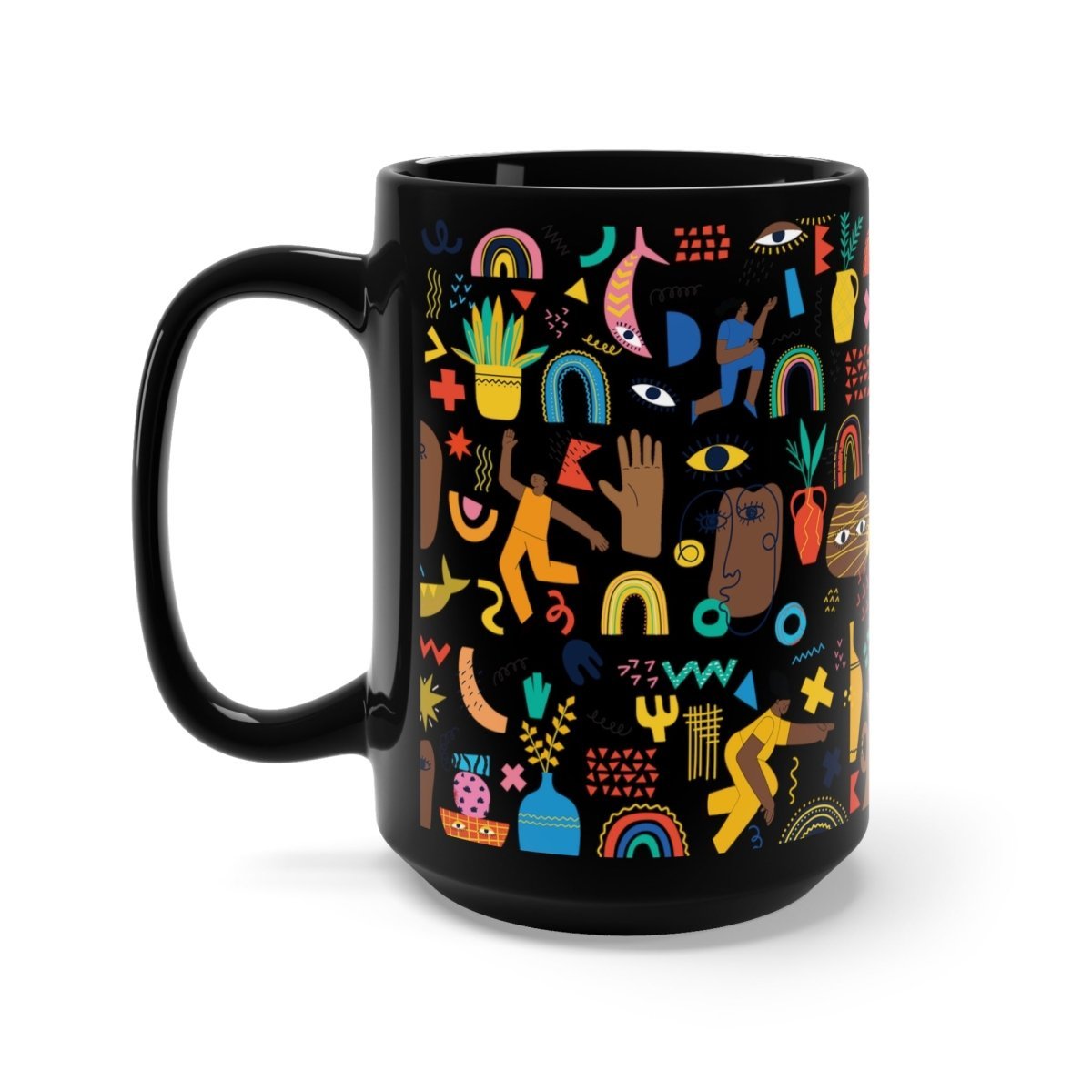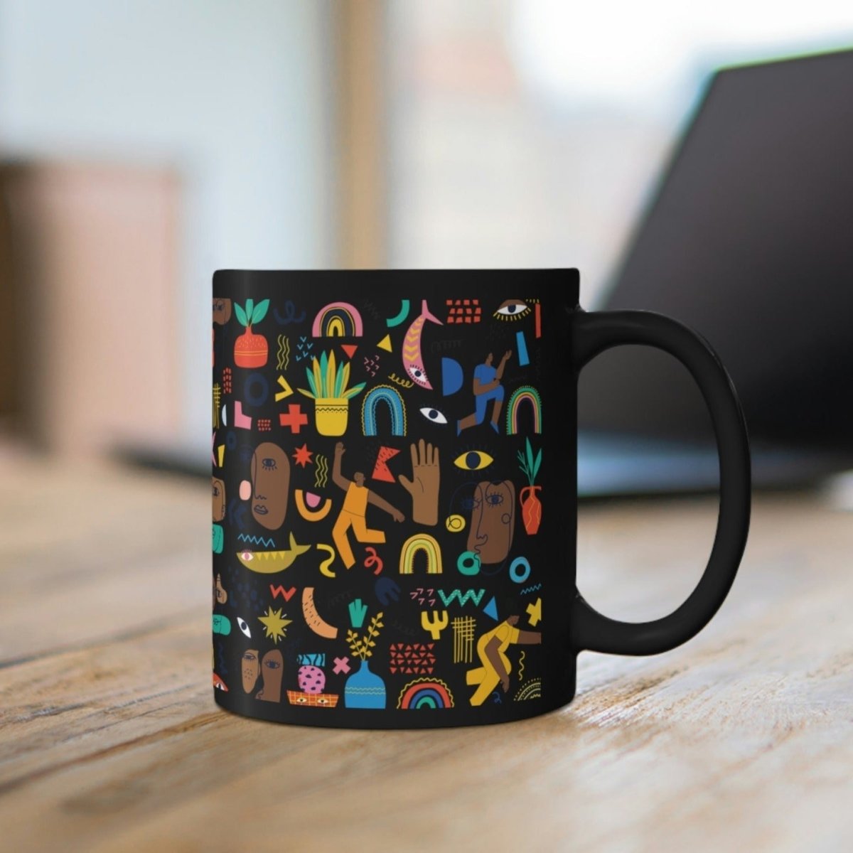 This black mug features brown people, line art faces, and geometric shapes combined into an abstract pattern. This artsy design appears against a ceramic mug that’s perfect for everyday use. It also offers a classic shape and is durable enough for the dishwasher and microwave. Available in 2 sizes.