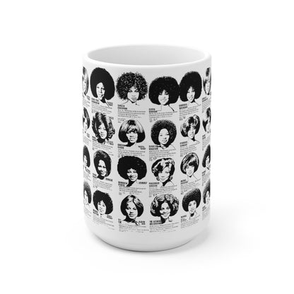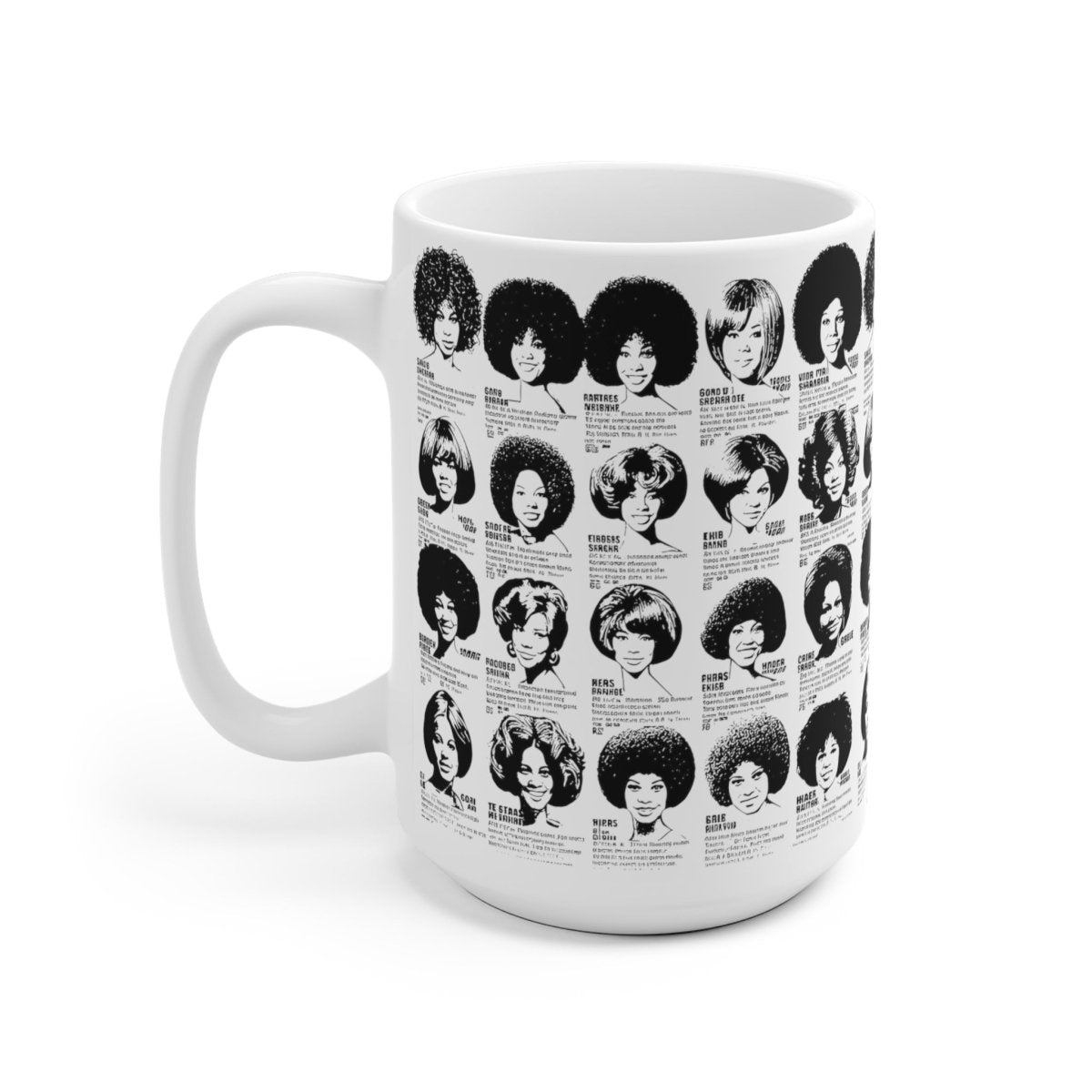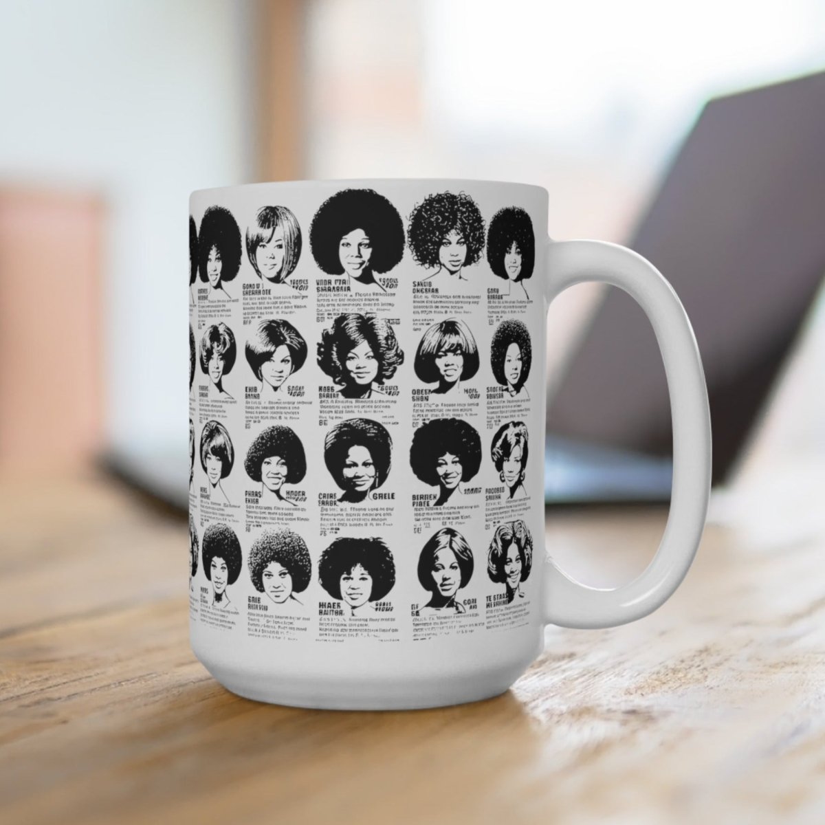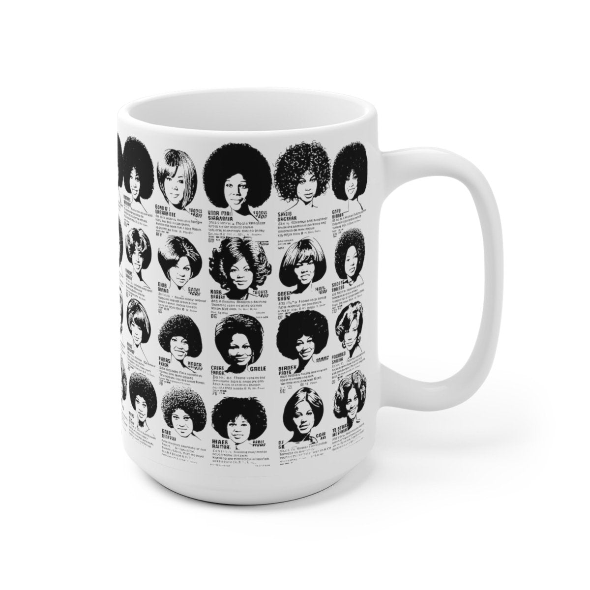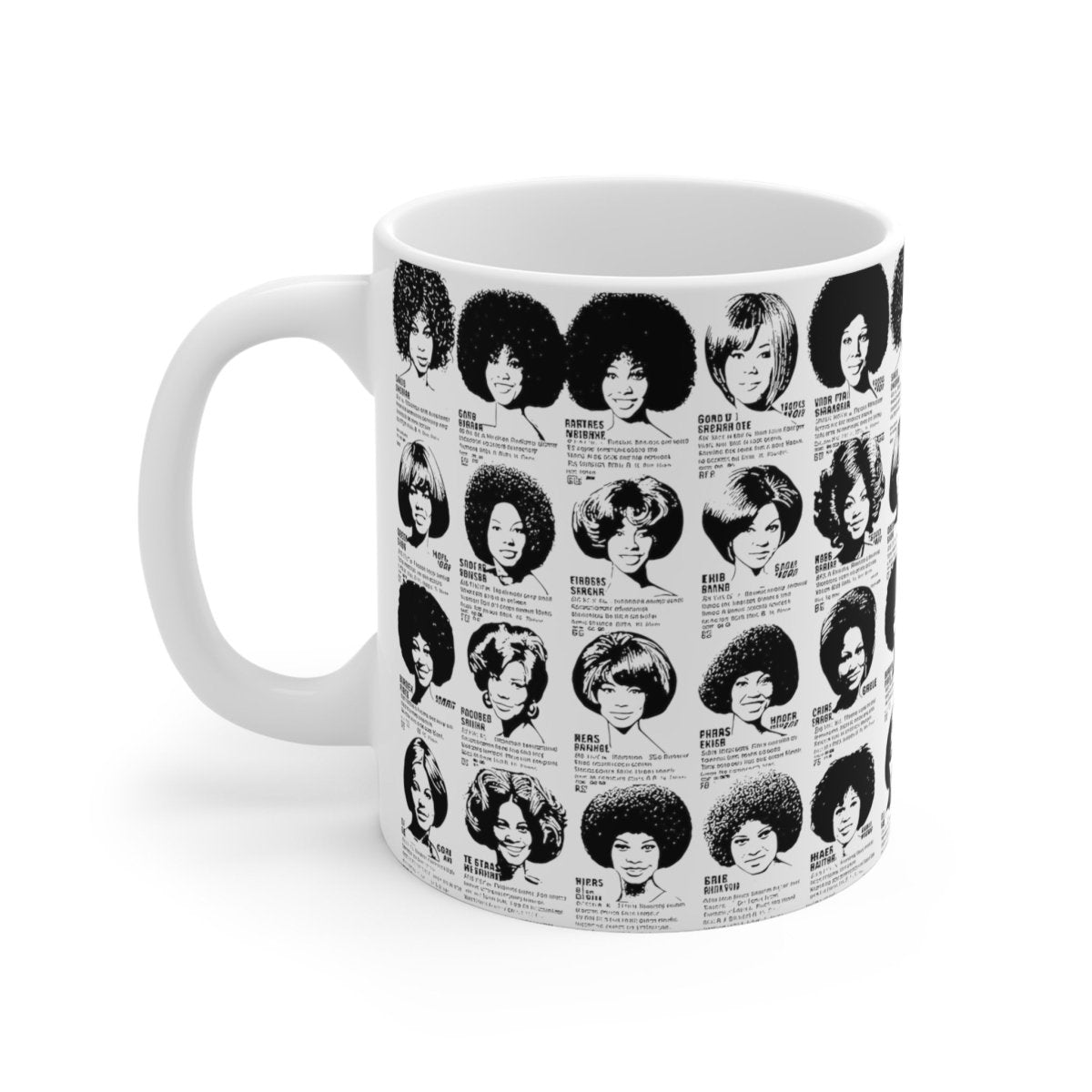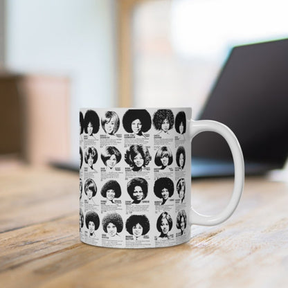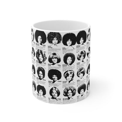 This ceramic mug features a vintage style wig ad with intentional unreadable text and descriptions. The illustrations include ladies with a variety of old school hairstyles who now appear on a cup that's perfect for coffee, tea, or hot cocoa. It also offers a classic shape and it's durable enough for the dishwasher and microwave. Available in 2 sizes.