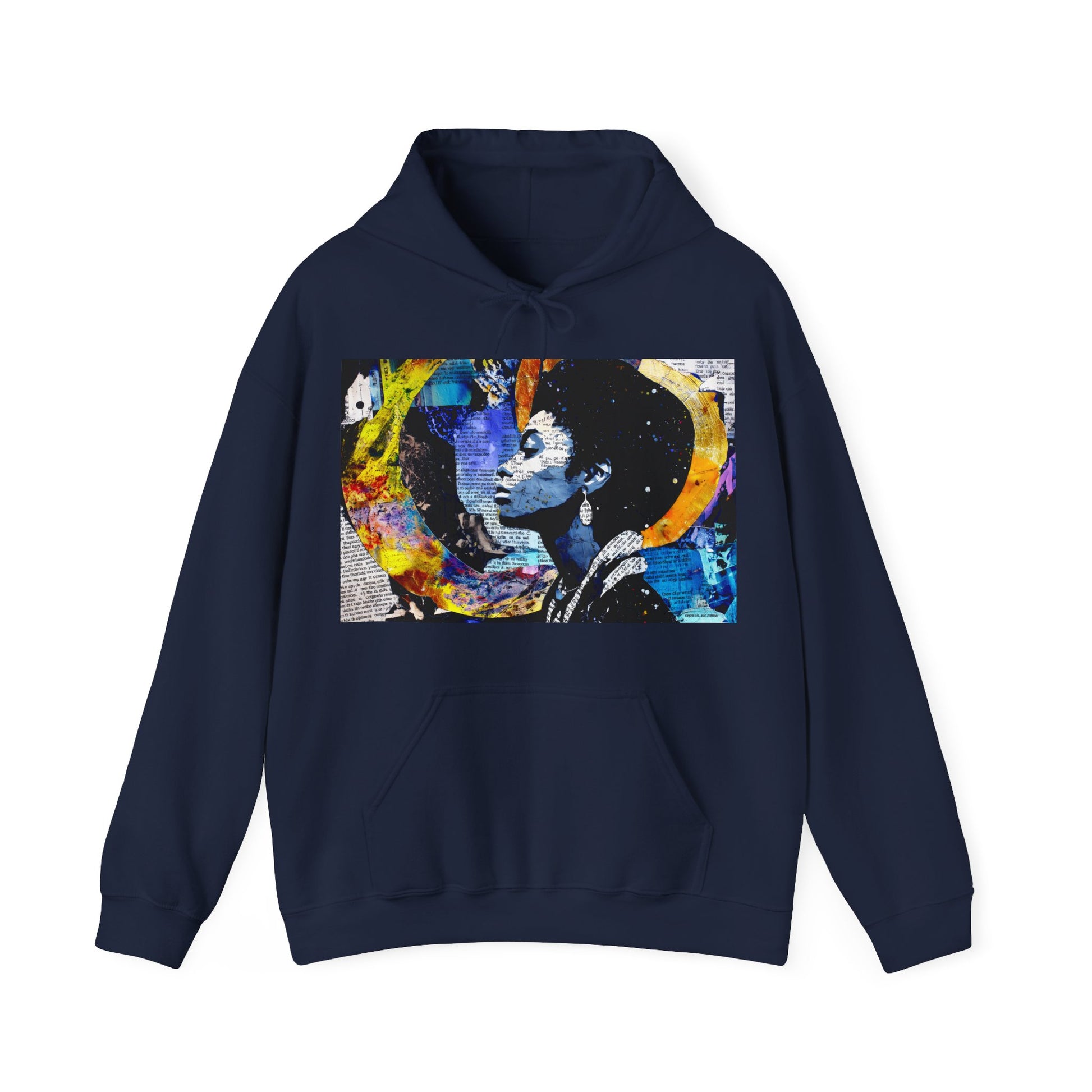 This adult unisex hoodie features an afrofuturist collage centered on the profile of a powerful Black woman set against a cosmic field. Fragments of vintage book text layer across her face and silhouette, merging with painted strokes until language dissolves into texture. A crescent arc rises behind her natural afro, while washes of blue, gold, and electric pigment create a feeling of orbit and expansion. The obscured lettering is intentional, transforming history into atmosphere and blending memory, identity, and speculative future within one unified composition.