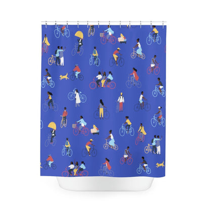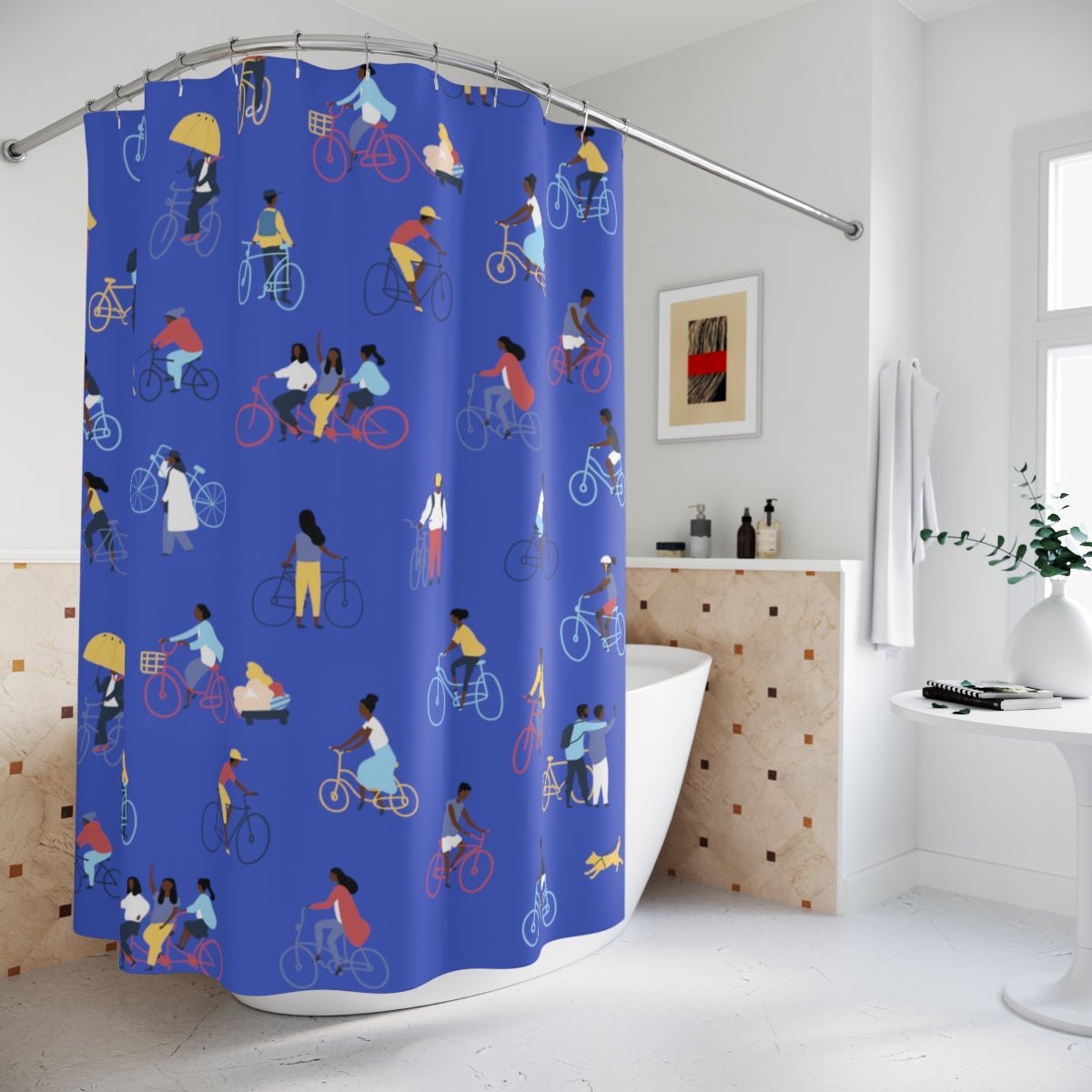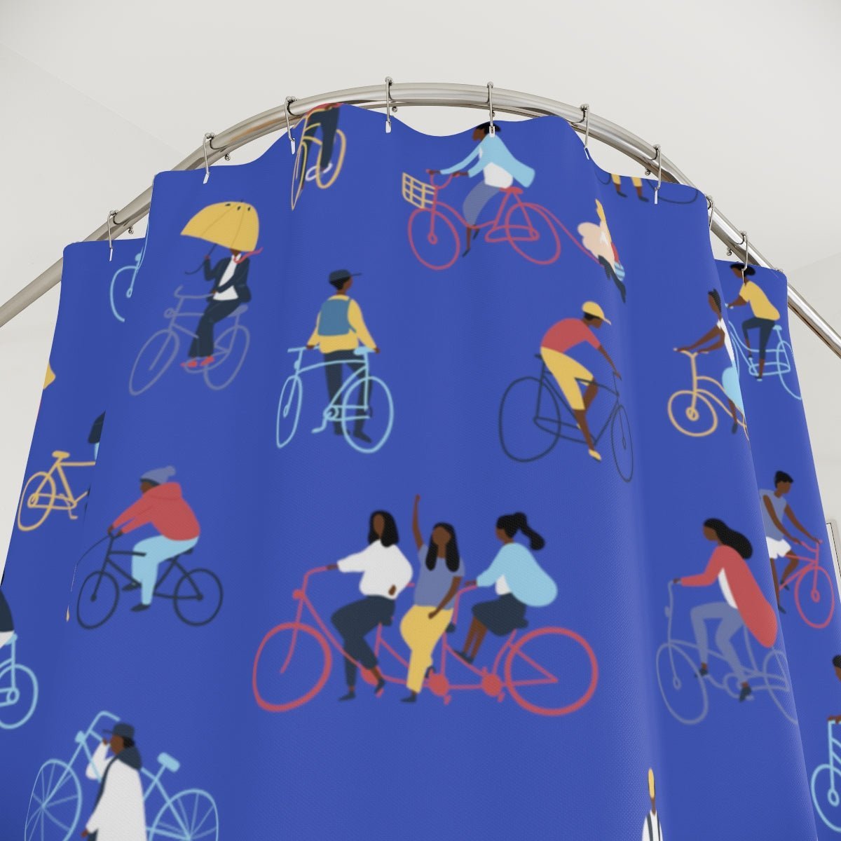 This shower curtain features brown people on bicycles. Created to turn any bathroom into a personal black culture haven, these custom curtains are a perfect one-sided canvas for power and pride. Made with 12-stitch enforced eyelets and a 100% polyester material, these bathroom decorations are built to last. Printed in full color 71" x 74" print for a vivid end result that stuns every time you look at it, this is the perfect home decor gift for us. Hooks not included.