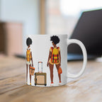 This mug features a vibrant design of four young black women with their suitcases, ready for their summer travel plans. Inspired by vacations and the spirit of adventure, the image appears as an all-over printed design, wrapping around the entire mug. Available in two convenient sizes, this mug is perfect for your morning coffee or afternoon tea. Choose between the 11oz or the larger 15oz mug to suit your beverage needs. Made from 100% white ceramic, this mug ensures a sturdy and long-lasting product. It's safe for both dishwasher and microwave use, making it perfect for daily use. The classic shape features rounded corners and a comfortable C-handle for easy gripping. This mug is lead and BPA-free, ensuring your drinks are safe and free from harmful chemicals. Personalize your mug upon request to make it uniquely yours. Whether you're planning your next trip or simply daydreaming about far-off destinations, this mug is the perfect companion. Enjoy a stylish and practical addition to your kitchenware collection, celebrating the joy of travel and adventure.