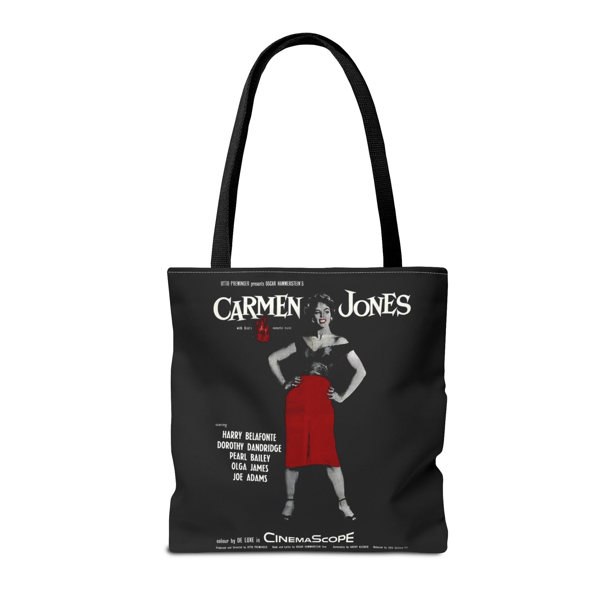 This tote bag features a restored vintage theatrical poster for Carmen Jones (1954), highlighting Dorothy Dandridge at center alongside the original film typography and cast imagery. The artwork has been digitally remastered to enhance clarity and color while preserving its classic mid-century poster style. The design celebrates Black cinema history and the lasting presence of Dorothy Dandridge in Hollywood’s golden era.