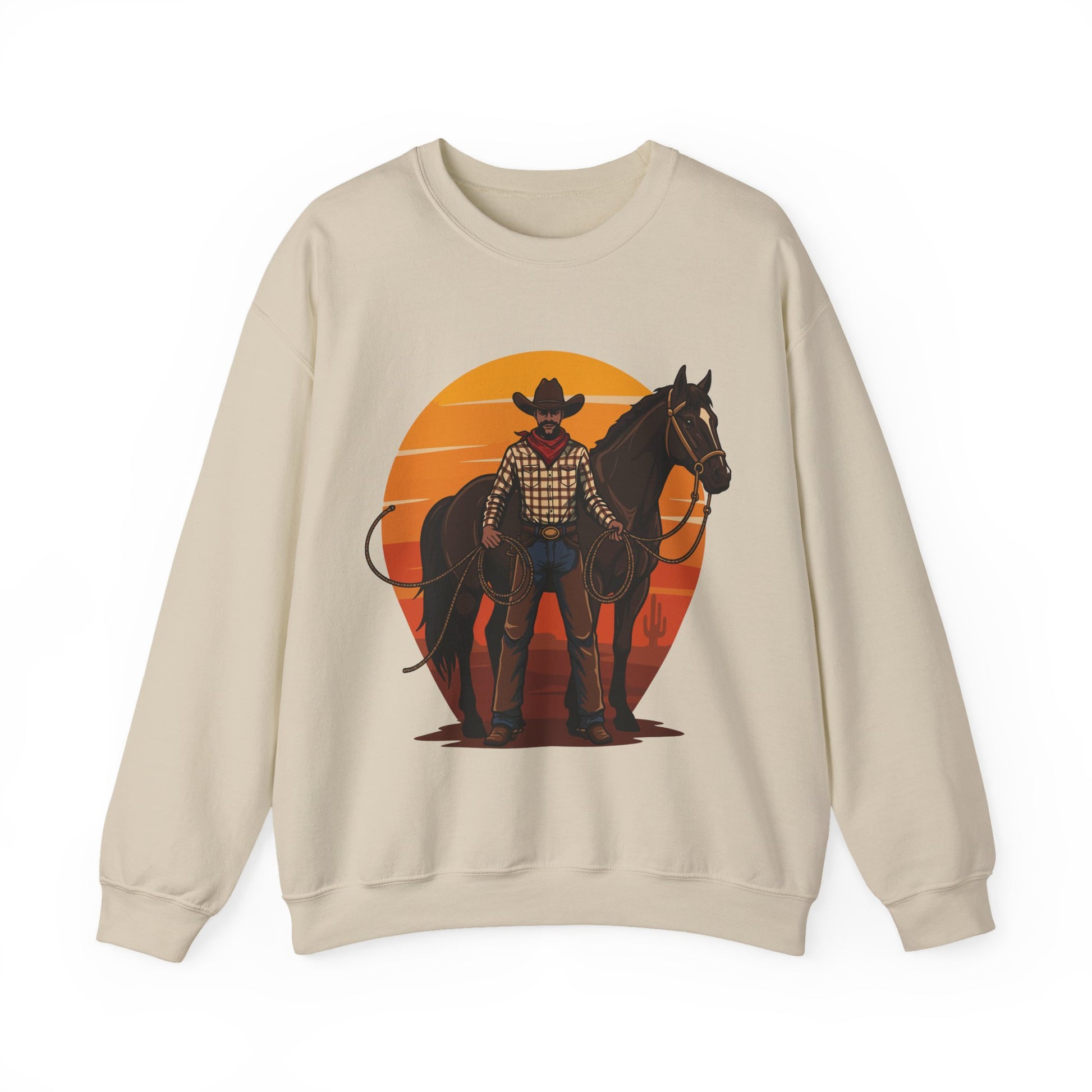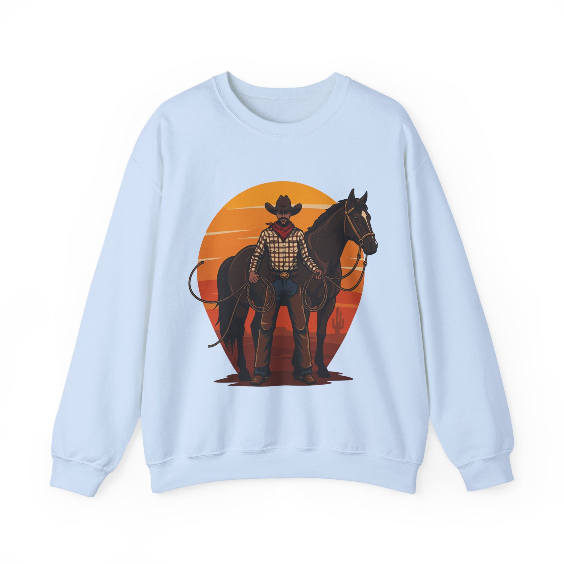 This adult unisex sweatshirt features a Black cowboy and his horse, set against a golden sun. Rendered in a restrained palette of black, brown, and warm ochre, the artwork draws from vintage Western poster style with a clean, modern graphic feel. Available in multiple colors and sizes, this sweatshirt makes a thoughtful gift for rodeo fans, Western movie buffs, and those who appreciate the history of the Wild West.