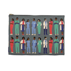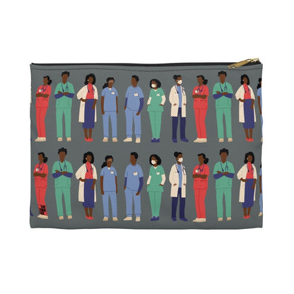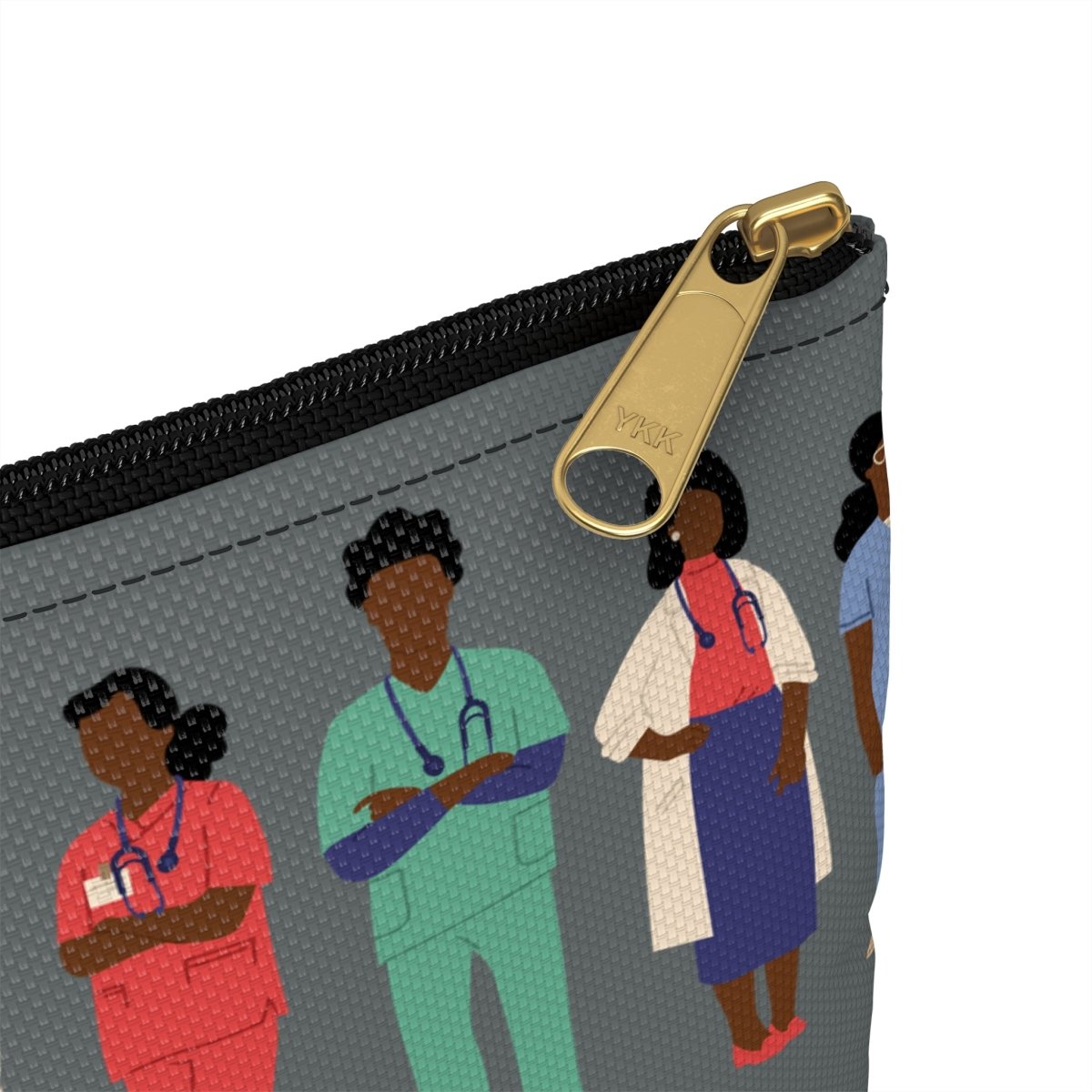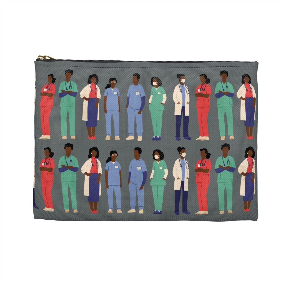 This zipper pouch is inspired by the black doctors, nurses, and medical professionals. Illustrated in different shades of brown, they're ready to save lives. The pouch comes in 2 sizes and can be used for pretty much anything. Great for everyday or travels across the globe. It's constructed of a durable material with a gold zipper closure. The fabric is 100% polyester and made to last. It also features a non-laminated lining and flat corners. Please check images for sizing chart. Easily customizable upon request.