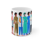 This mug showcases an inspiring design featuring black women excelling in various medical professions, including a doctor, vet, pediatrician, holistic health provider, and paramedic. The artwork spans the entire mug, celebrating the dedication and expertise of those who work in healthcare, as well as med school students and those with STEM interests.