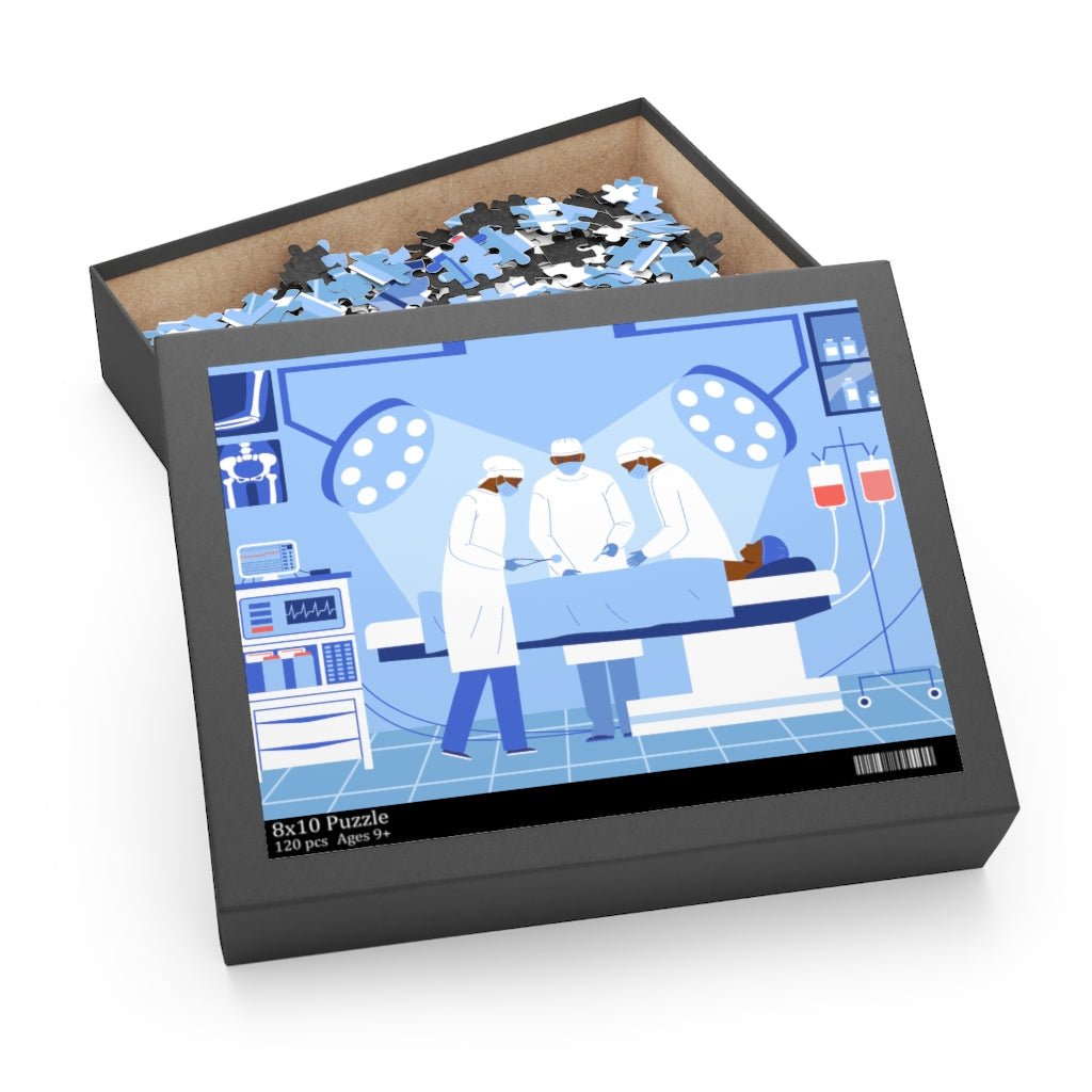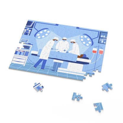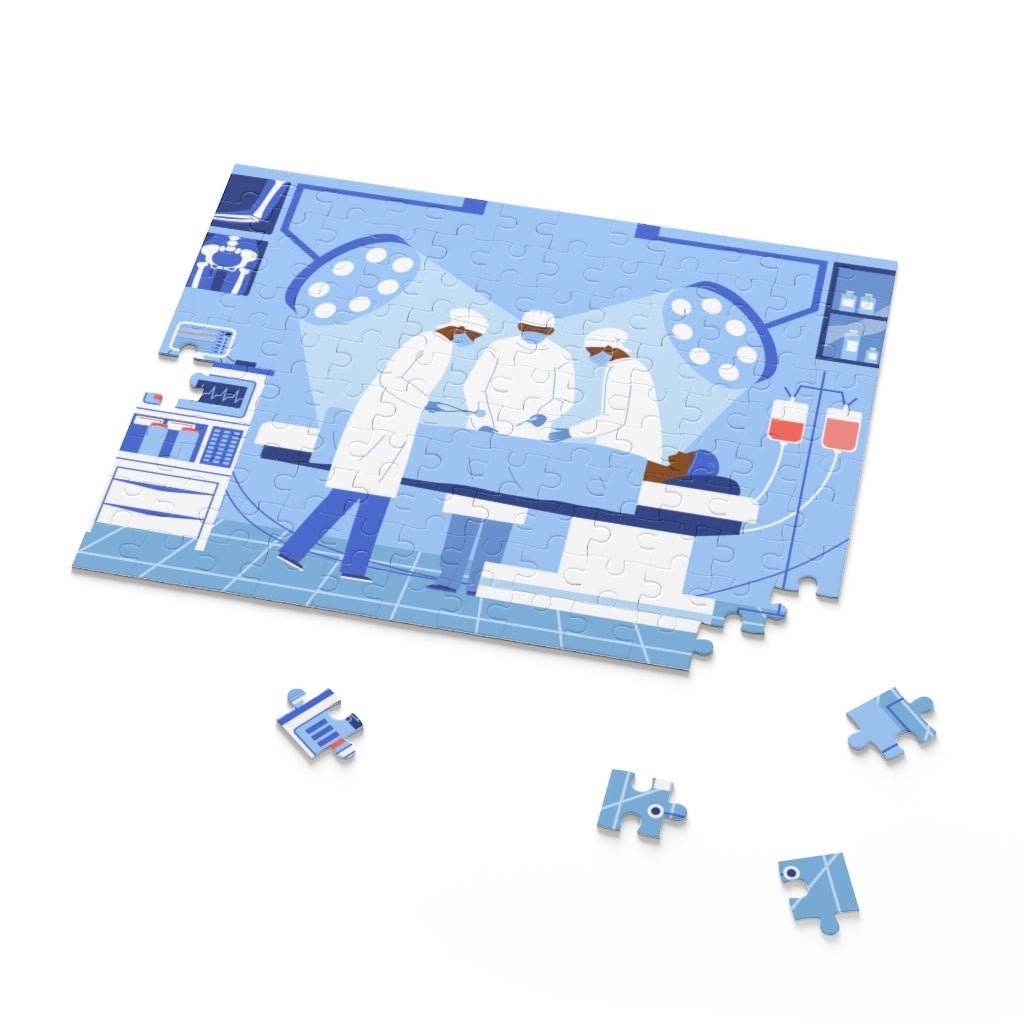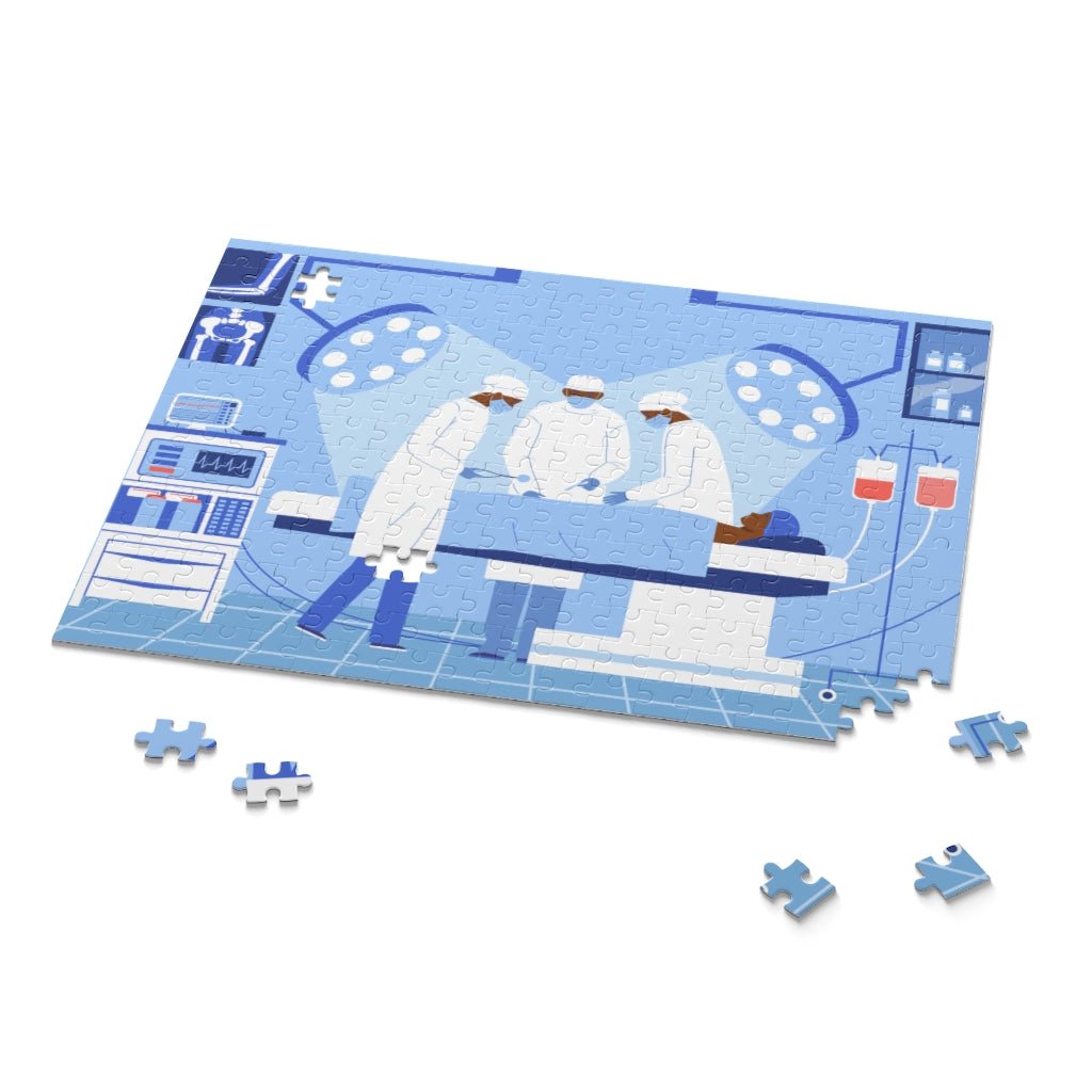 This puzzle features black doctors performing surgery. An excellent gift for friends and family, it's a jigsaw made made with quality chipboard pieces. It ships in a gift-ready box which also features the art on the cover. Neither the box or puzzle pieces come enclosed in plastic. Available in 3 sizes including: