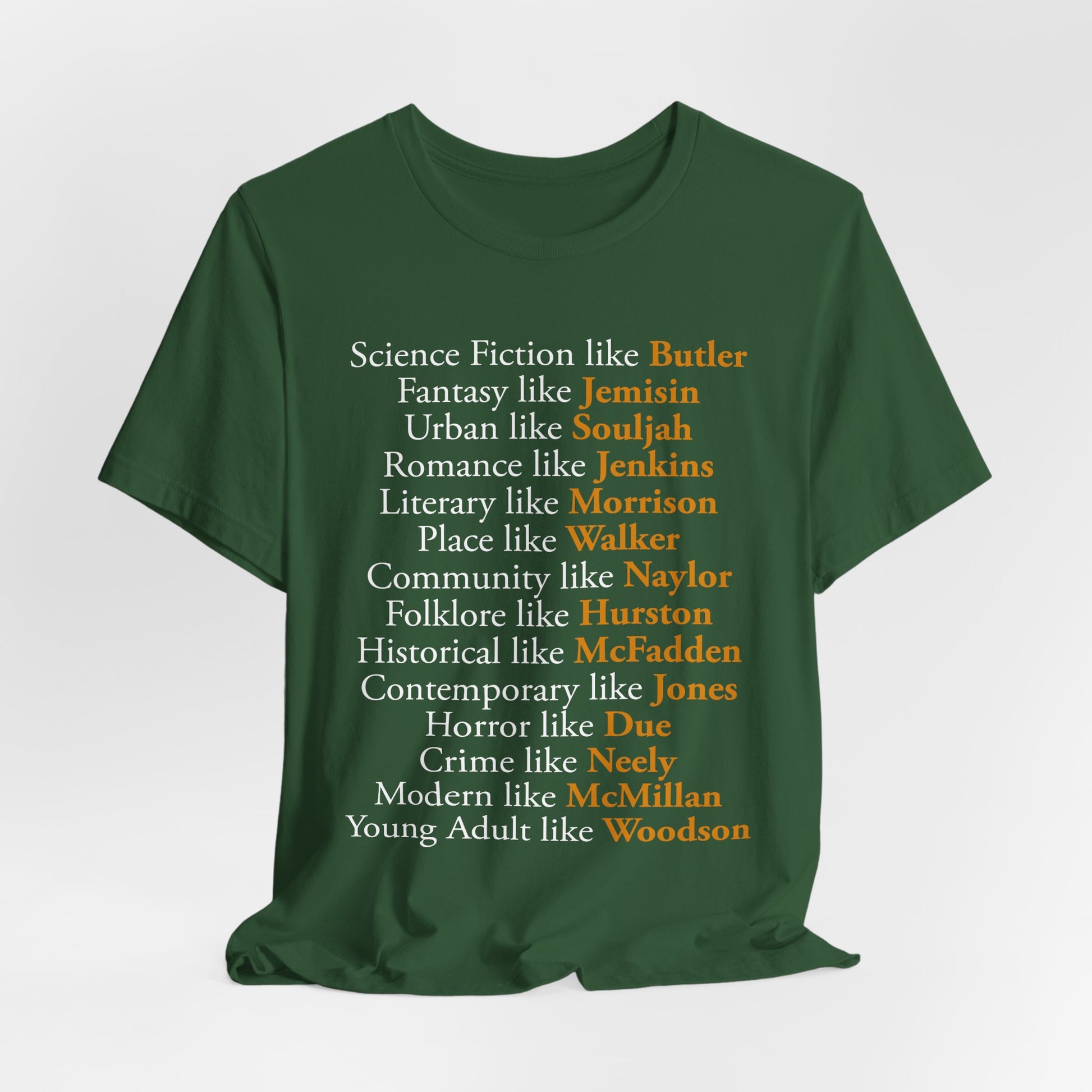 This unisex tee is storytelling you can wear, celebrating the brilliance and expansive range of Black women authors across every literary category. From the world-building of science fiction and fantasy to the heart of romance, folklore, and contemporary prose, this clean, text-forward layout honors the profound influence of Black voices in literature. Because your reading journey is unique, this design is fully customizable. You have the freedom to swap the authors, update the genres, or even add your own name to the list of greats. No debates and no controversy--just a flexible, sincere tribute to the creators who reflect your personal literary world.