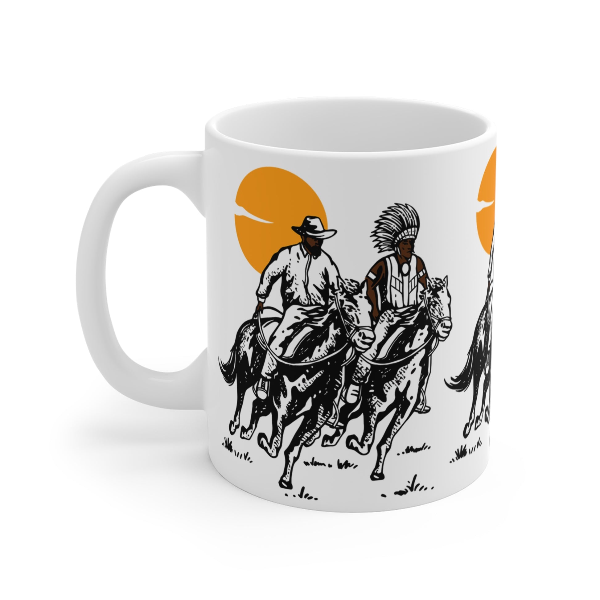 This ceramic mug features a repeating wraparound illustration of a Black cowboy and a Native rider on horseback, set against a bold golden sun. Rendered in a restrained palette of black, brown, and warm ochre on a white background, the artwork draws from vintage Western poster style with a modern graphic feel.