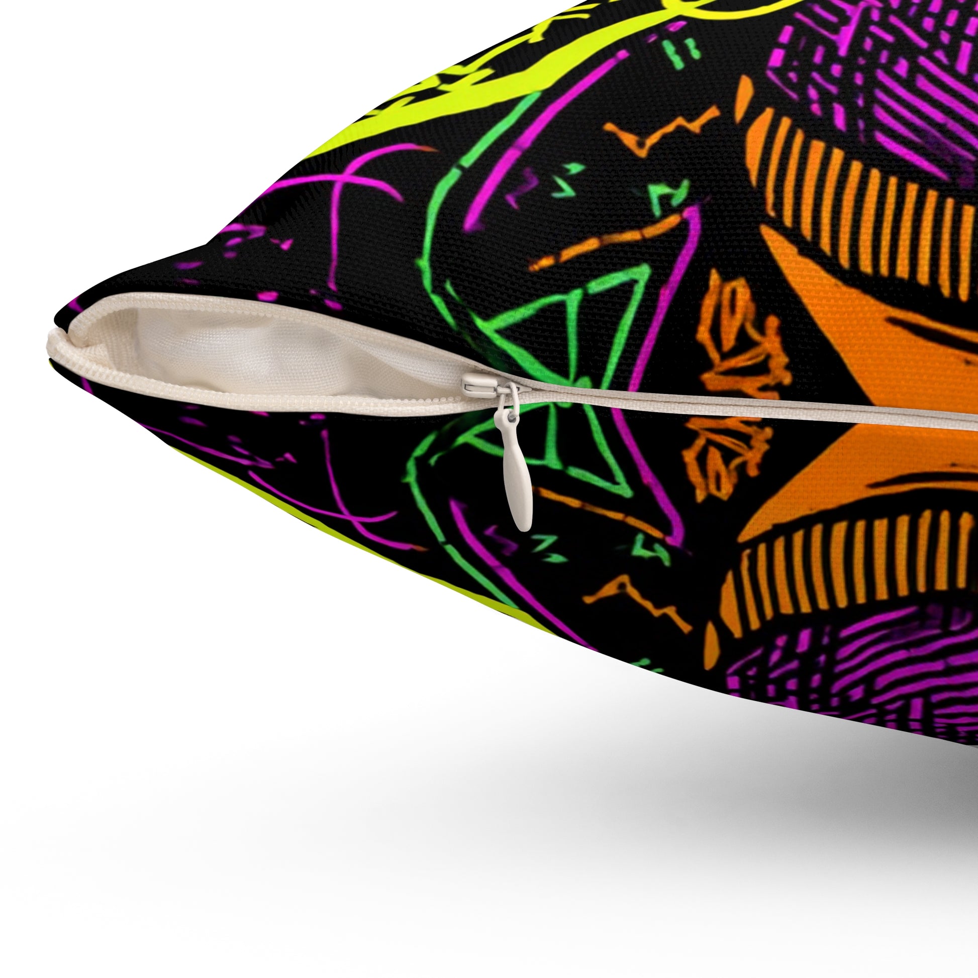 This square throw pillow features a graphic portrait of a Black woman with a natural afro, rendered in vivid neon tones and high contrast color blocking. Bright greens, oranges, and purples layer across her face and hair, framed by expressive line work and abstract symbols that echo street art and contemporary pop illustration. Her steady gaze and sculpted curls center Black beauty as confident, modern, and unapologetically expressive, turning the pillow into a vibrant statement piece for any space.