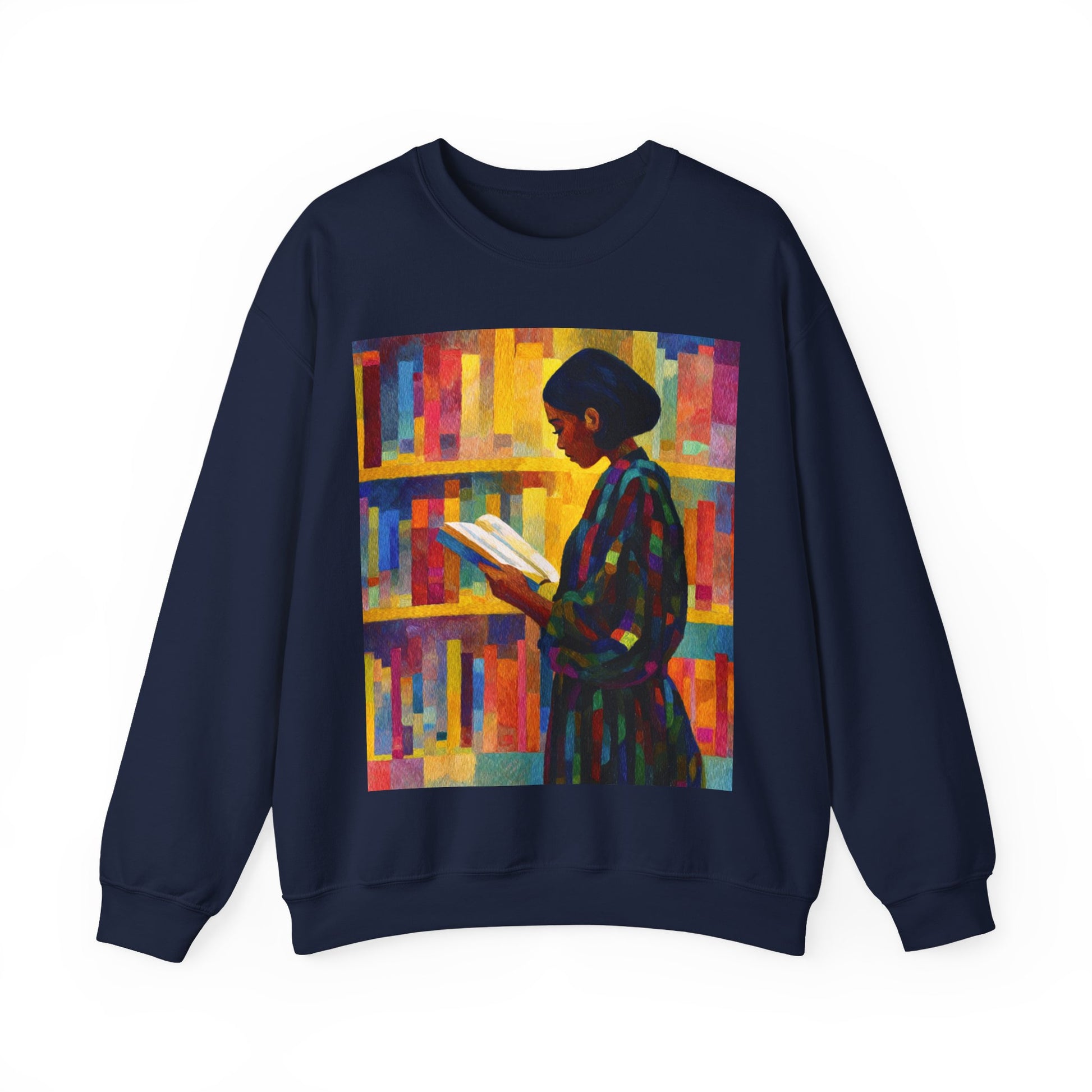 This adult unisex sweatshirt features a Black woman absorbed in a book, framed by colorful layered shelves in a sunlit library. The artwork offers an expressive feel, celebrating imagination, knowledge, and the quiet power of reading. Whether set in a neighborhood bookshop or a private home library, the design honors Black womanhood in a space of reflection and creativity.