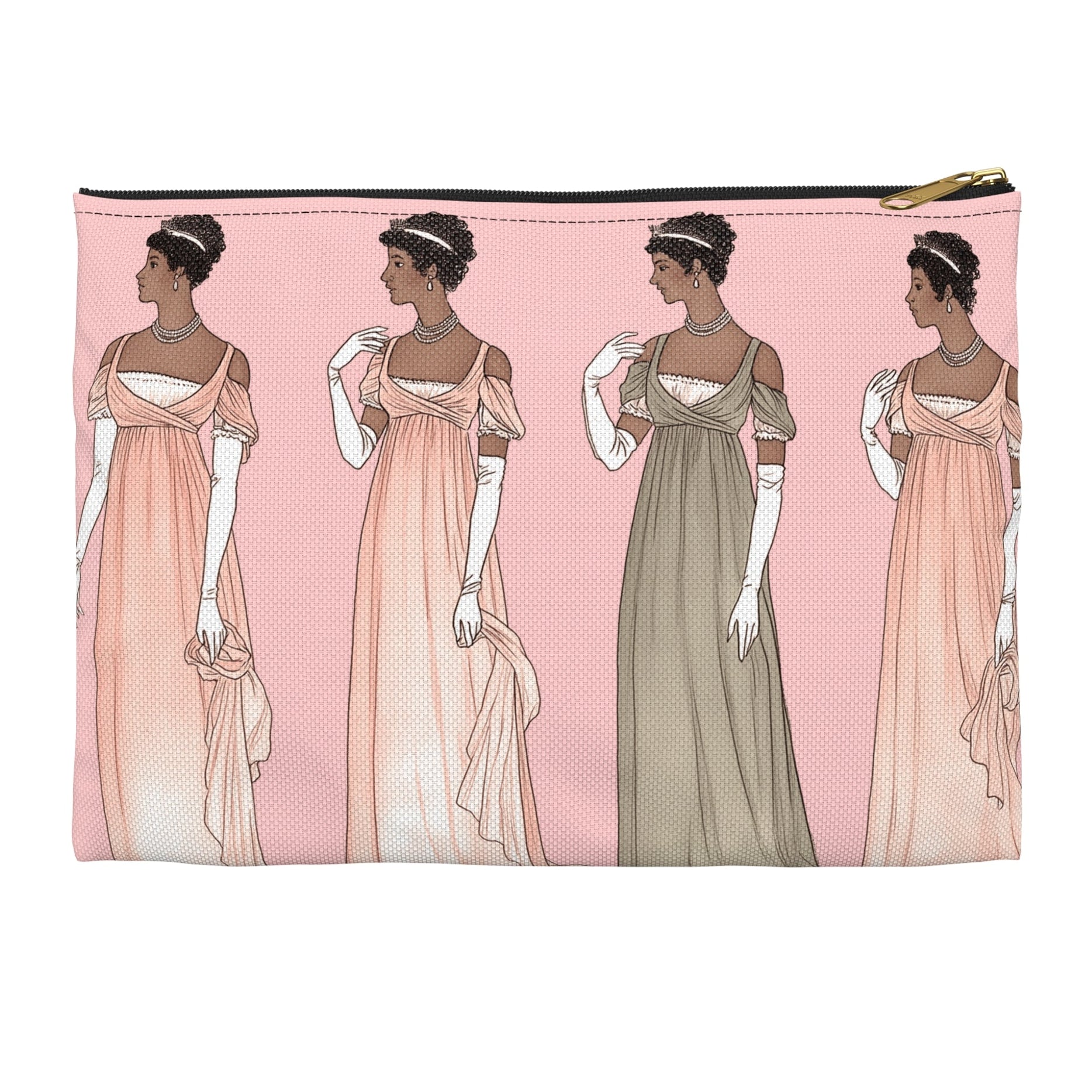 This accessory pouch features a row of elegantly dressed Black women in Regency era inspired gowns, illustrated in a refined fashion plate style. Soft blush tones create a romantic backdrop, while delicate gloves, pearl necklaces, and crowned updos evoke the charm of candlelit ballrooms, handwritten letters, and slow afternoon promenades. The composition feels like a page lifted from a nineteenth century society journal, celebrating grace, wit, and timeless femininity through a modern, inclusive lens.