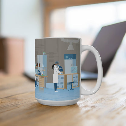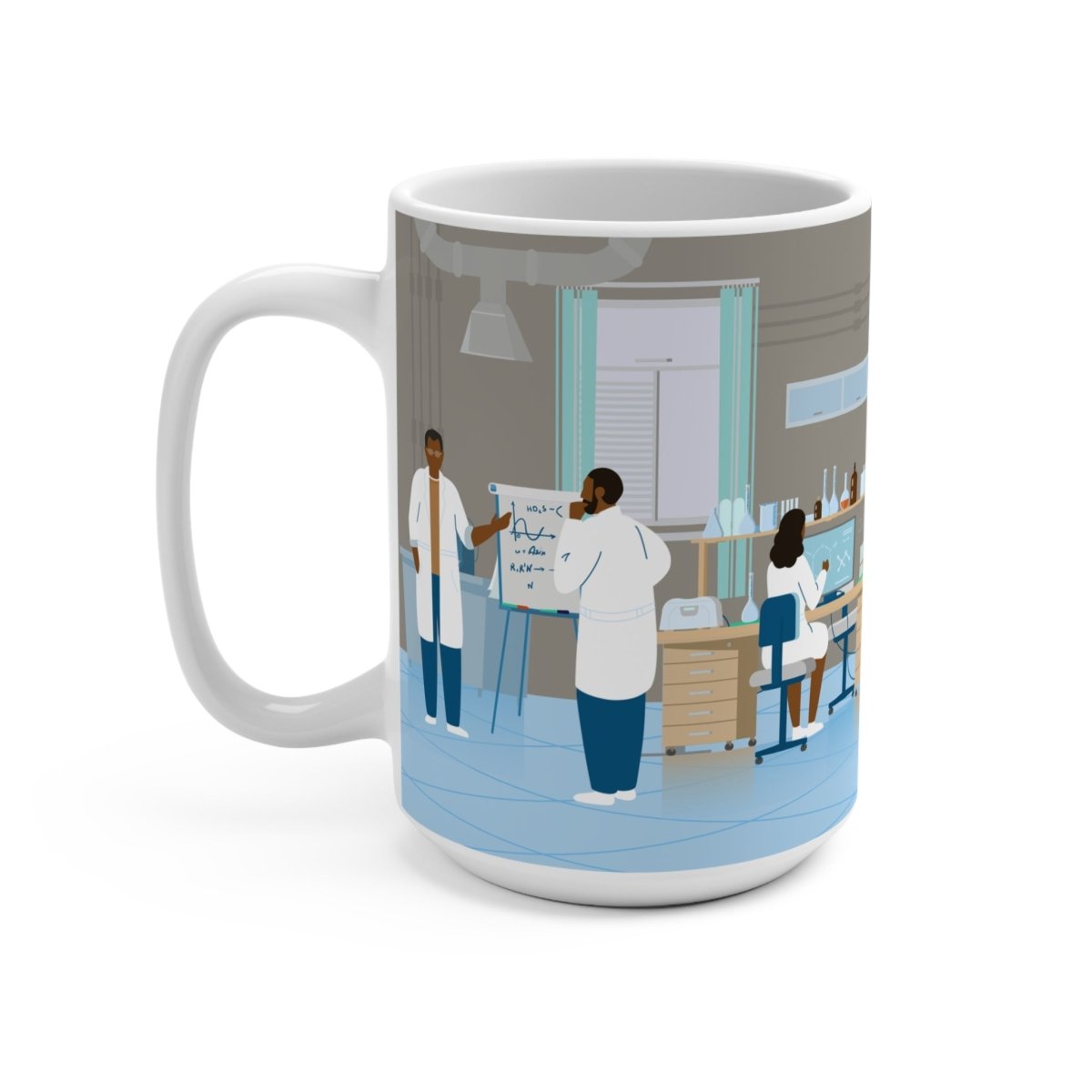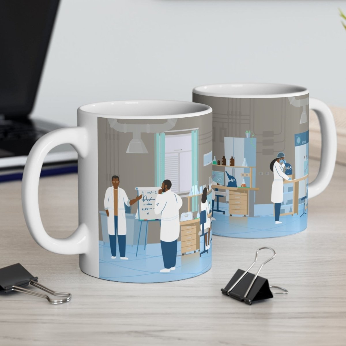 This ceramic mug features a detailed wraparound illustration of Black men and women working in a modern science lab. From examining slides under a microscope to solving equations at a whiteboard, the artwork celebrates collaboration, innovation, and Black excellence in STEM. The lab is filled with chemistry tools, computers, and other graphics—highlighting both the intellect and everyday hustle of scientific research. Available in 11oz (0.33 l) and 15oz (0.44 l) sizes, this white ceramic mug has a glossy finish and a sturdy C-shaped handle. It’s microwave- and dishwasher-safe, BPA- and lead-free. Custom options available upon request.