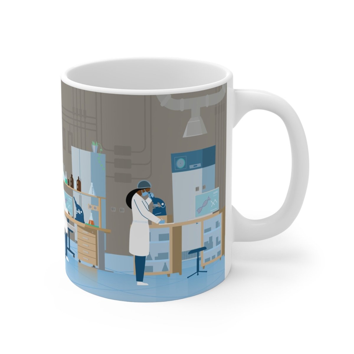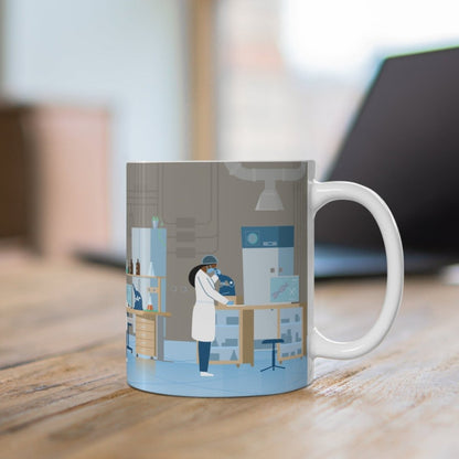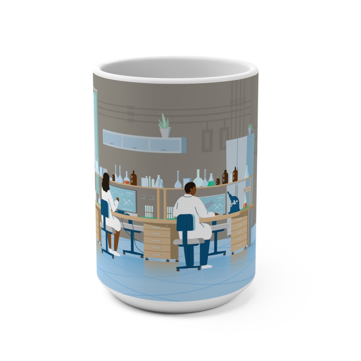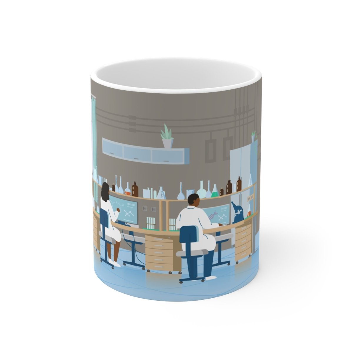 This ceramic mug features a detailed wraparound illustration of Black men and women working in a modern science lab. From examining slides under a microscope to solving equations at a whiteboard, the artwork celebrates collaboration, innovation, and Black excellence in STEM. The lab is filled with chemistry tools, computers, and other graphics—highlighting both the intellect and everyday hustle of scientific research. Available in 11oz (0.33 l) and 15oz (0.44 l) sizes, this white ceramic mug has a glossy finish and a sturdy C-shaped handle. It’s microwave- and dishwasher-safe, BPA- and lead-free. Custom options available upon request.