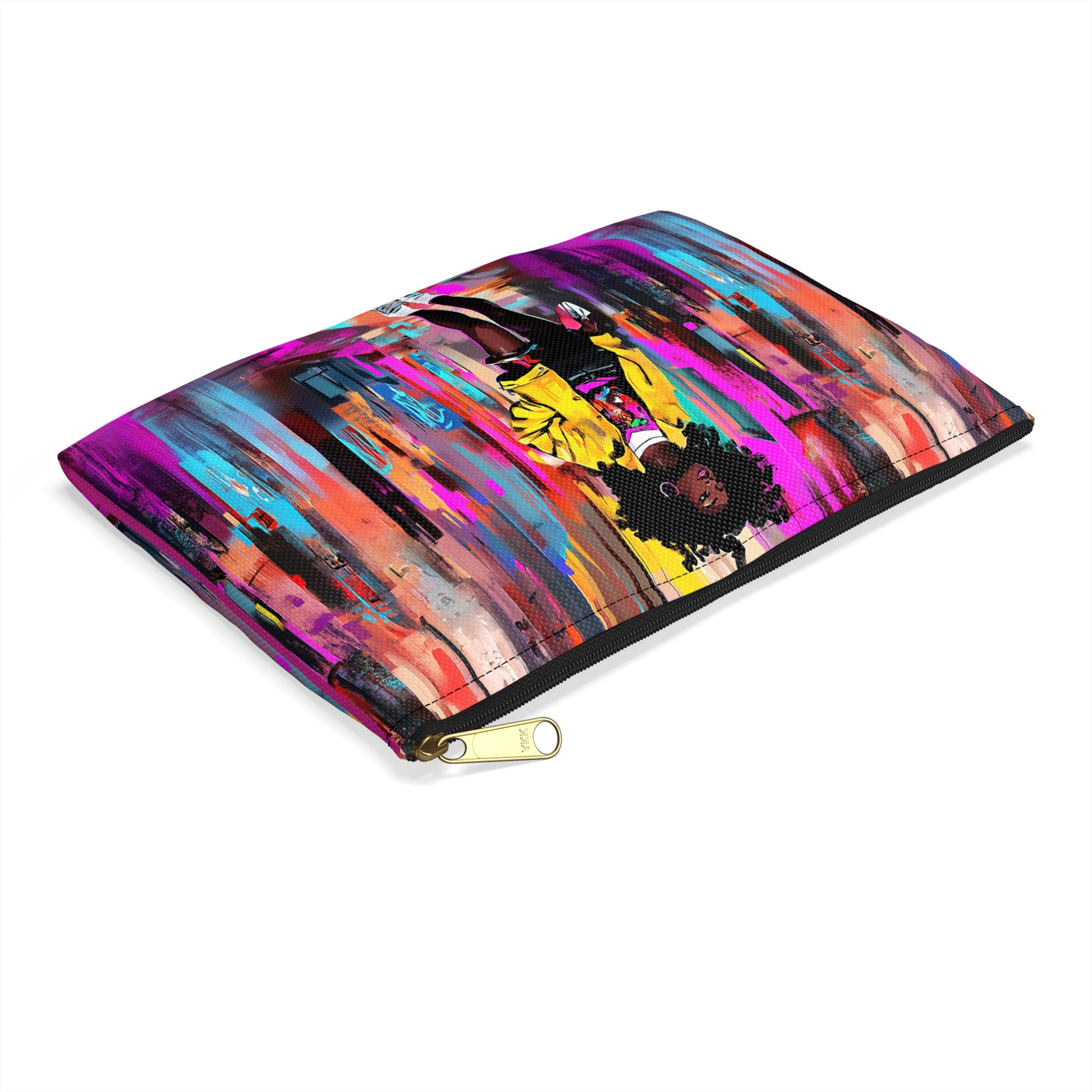 This accessory pouch features a digital portrait of a Black woman moving through a neon-lit street, her yellow jacket cutting through the electric glow. Her natural hair rises with quiet confidence, gold hoops catching the light as sneakers meet the pavement in purposeful stride. The graffiti-bright backdrop adds energy and edge, transforming a fleeting moment into a visual statement of presence, style, and Black girl power.