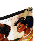 This small zipper pouch showcases a vintage-inspired image of four black women gathered with drink glasses, exuding melanin magic and timeless beauty. Available in two sizes, this versatile bag is perfect for anything from a pencil case to a cosmetic bag for travel. Made from durable 100% polyester, it features a sleek gold zipper closure and a non-laminated black interior with flat corners for a chic finish. Customization options are available upon request, and sizing details can be found in the images. A thoughtful gift for black girls and women who appreciate style and elegance.