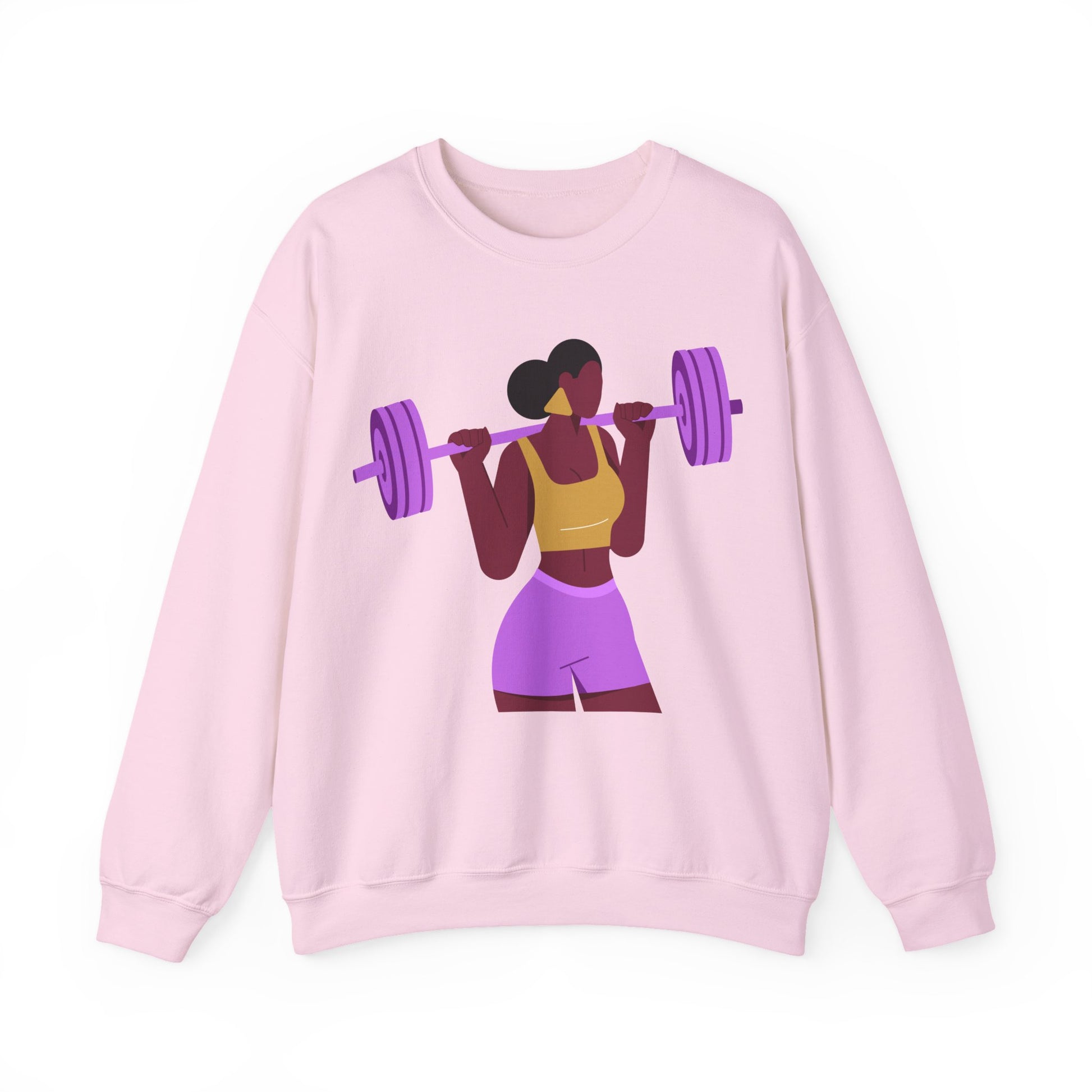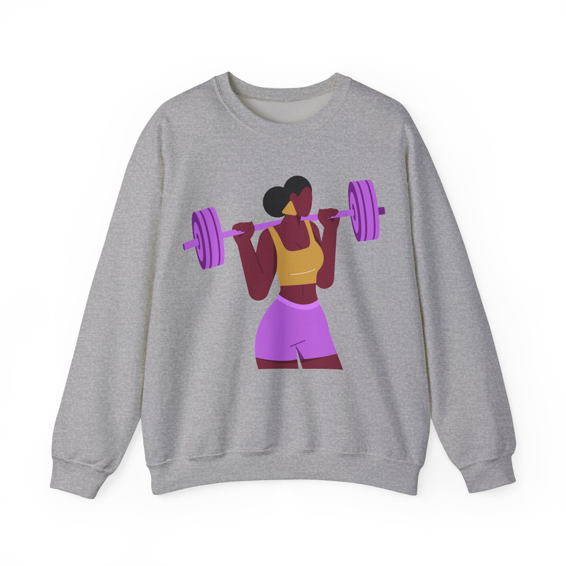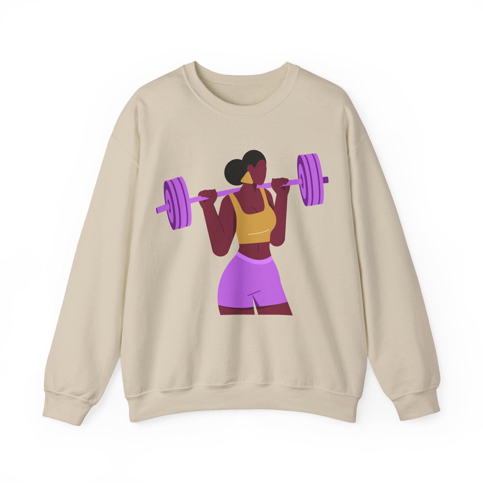 This adult unisex sweatshirt features a modern illustration of a Black woman lifting a barbell, captured in a simplified, graphic style that highlights strength, focus, and self-discipline. The rich purple tones paired with warm neutrals give the design a sporty yet stylish feel, celebrating everyday fitness and the power of showing up for yourself.