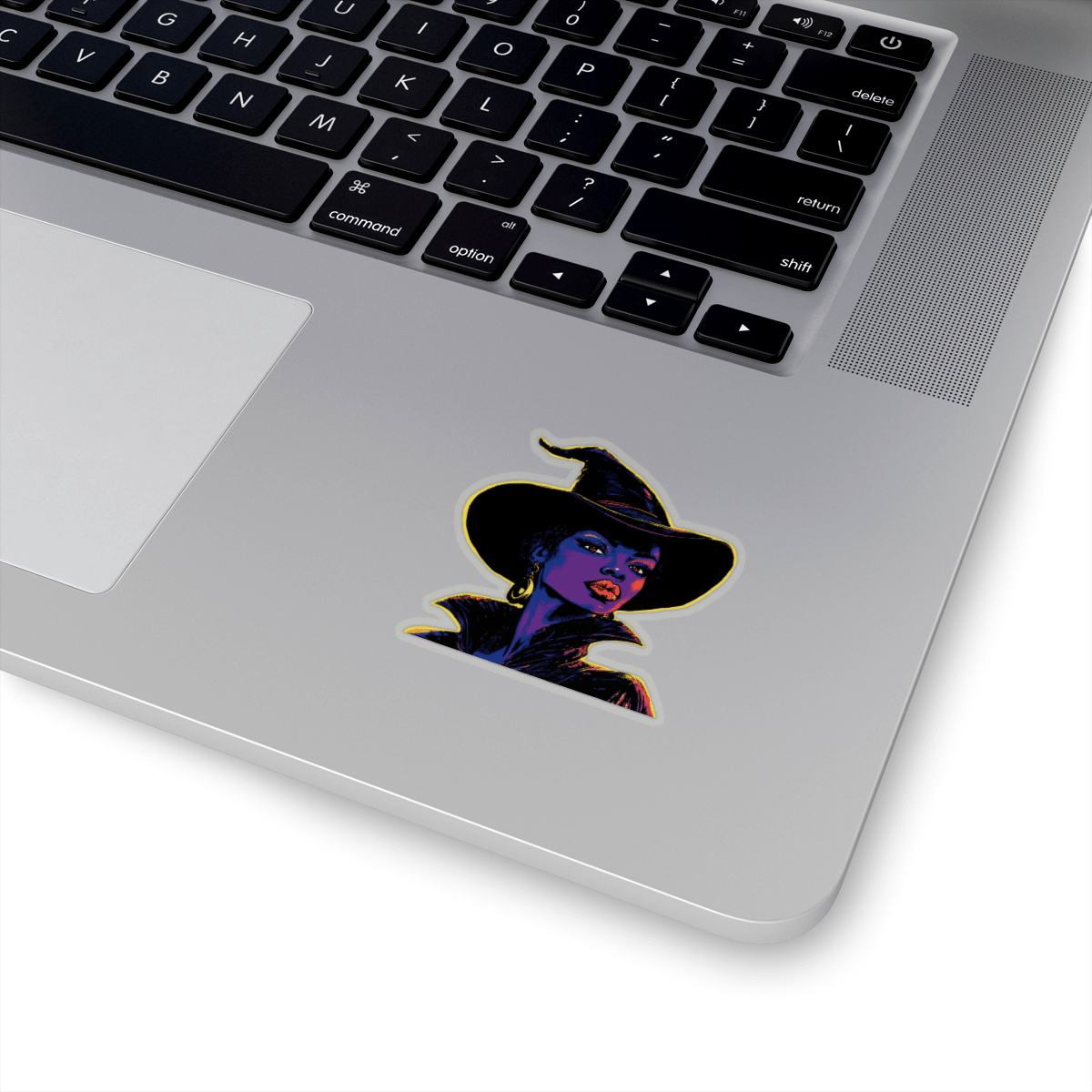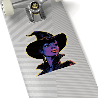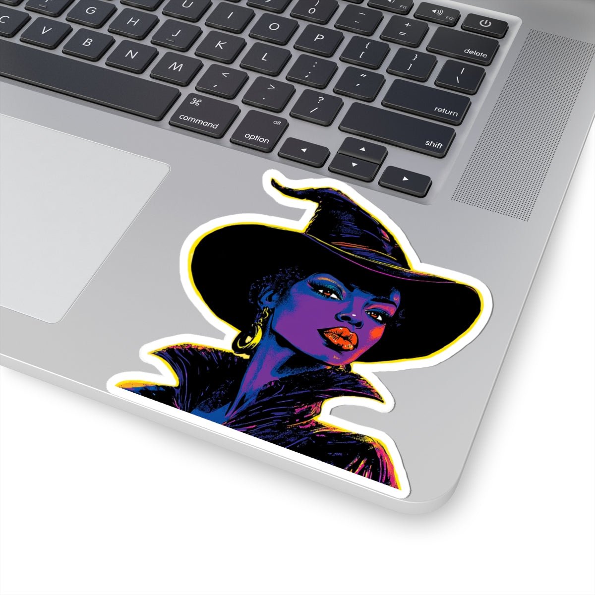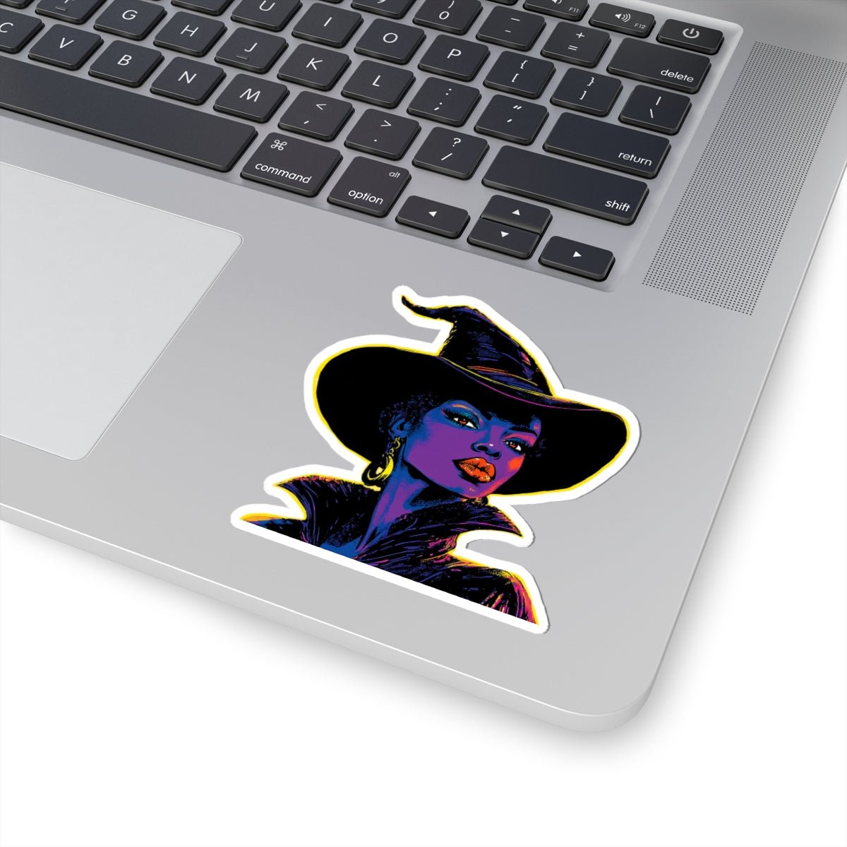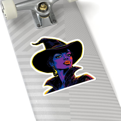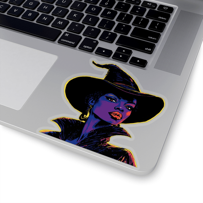 Make a statement with this witch sticker, featuring a Black woman in a wide-brimmed hat and high-collared cloak. Her confident gaze and vibrant neon tones create a mesmerizing blend of magic, mystery, and power. Perfect for those who love witchy aesthetics, Black girl magic, and sci-fi fantasy vibes.